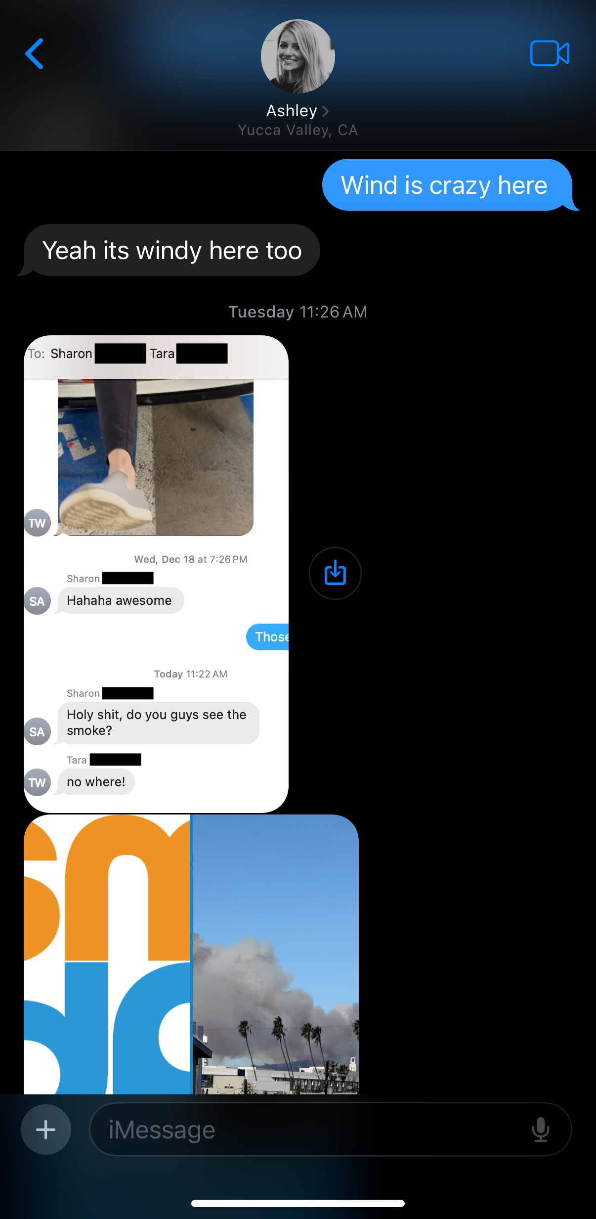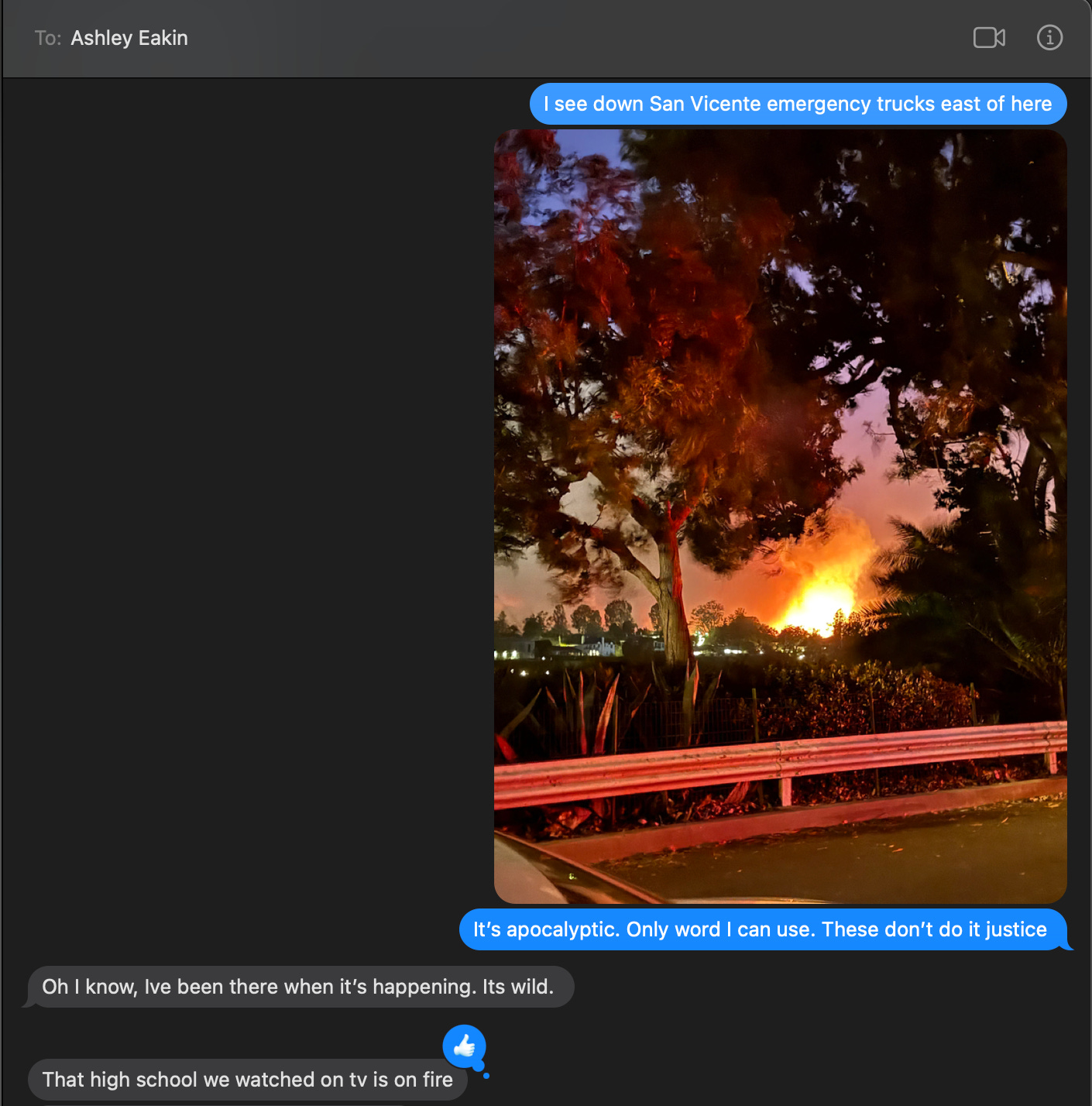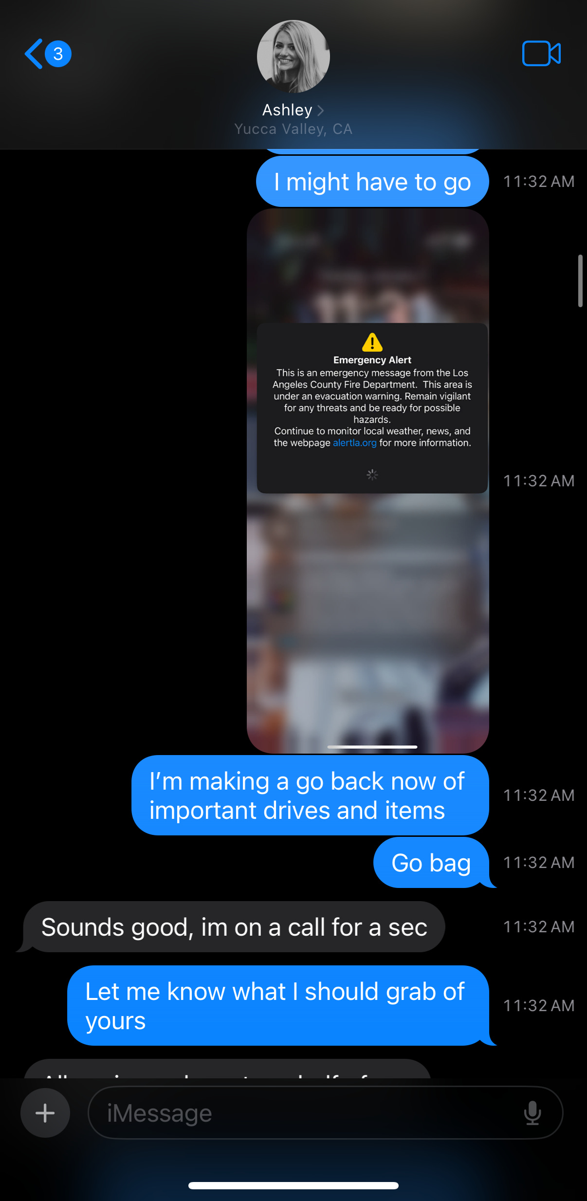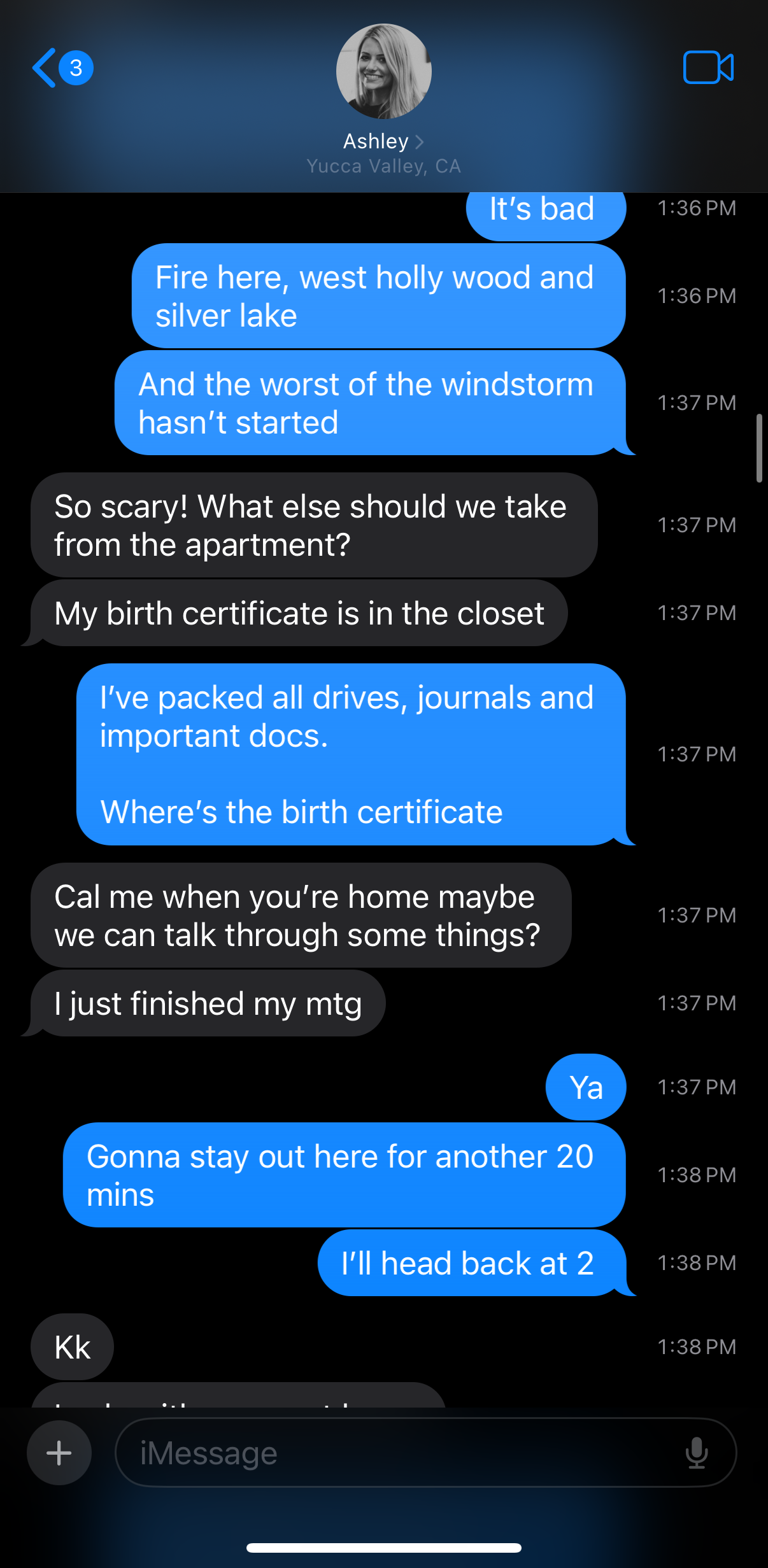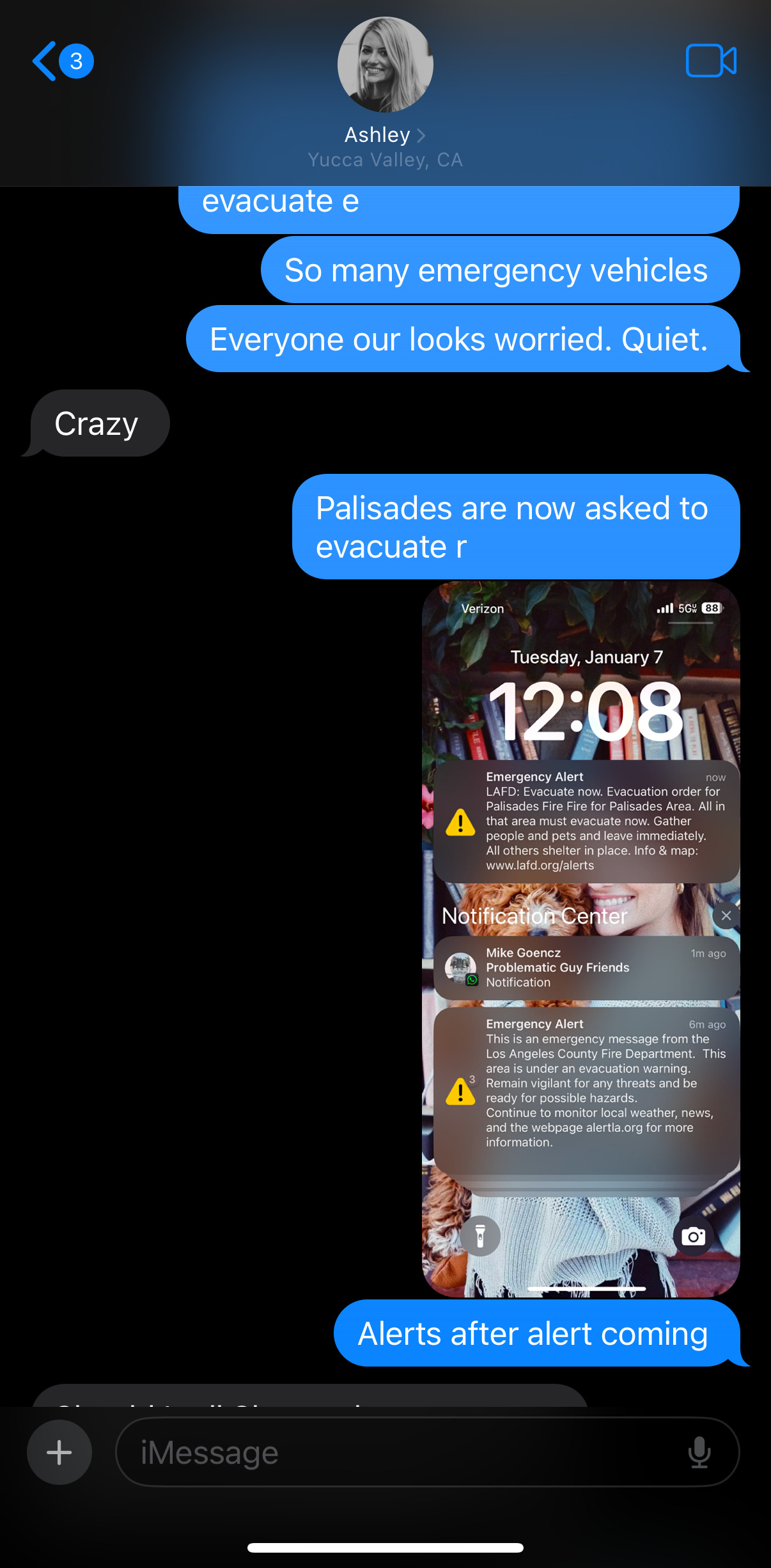 At midday on Wednesday, Ash and her friends had lost power in the desert. The Yucca valley was cycling power to avoid additional fires. We were at risk of being disconnected for a while, but I knew she was safe, and we just continued to coordinate in whatever way we could.