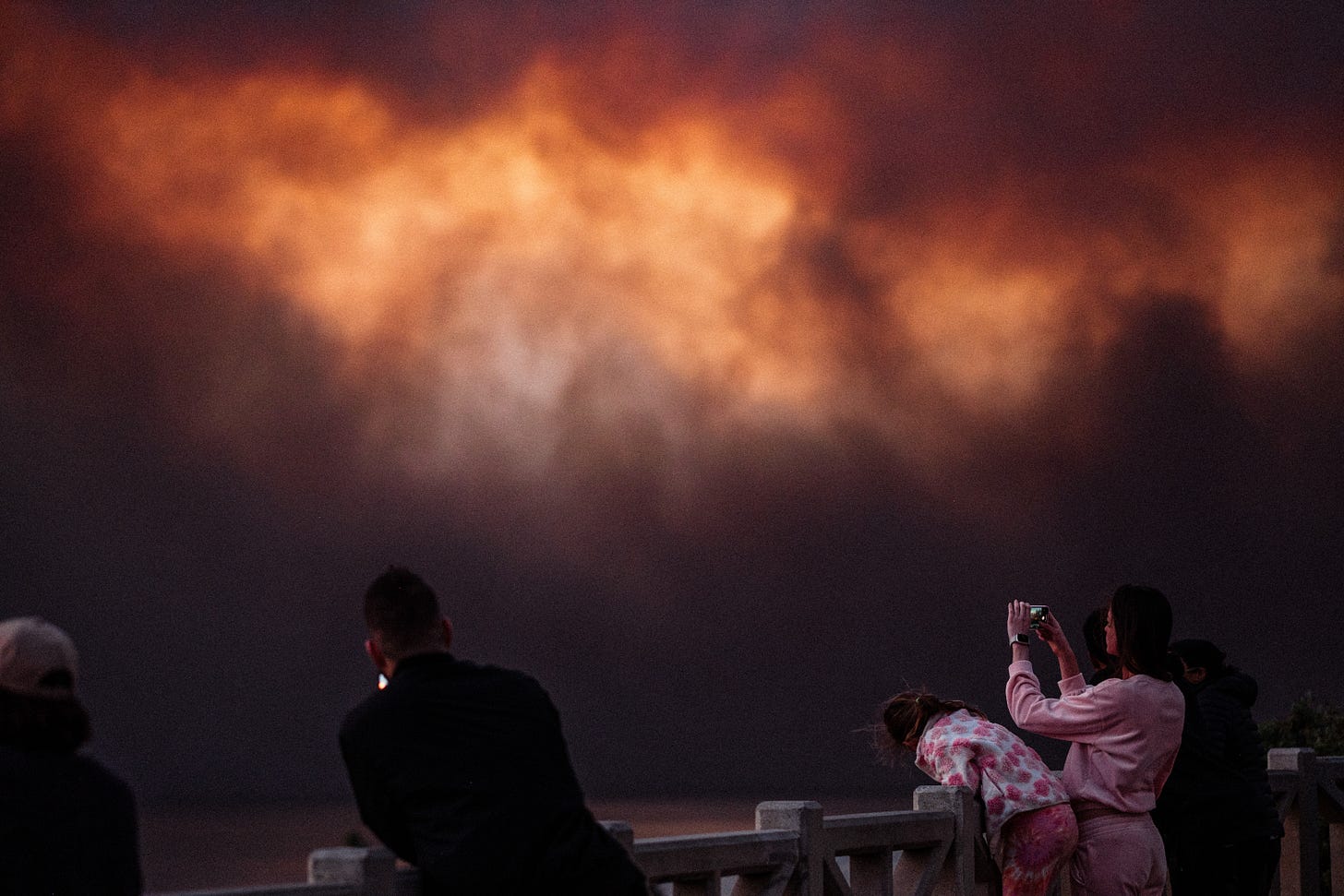 I decided to walk north and investigate further. At the north end of Santa Monica there is a set of stairs most often used by people for morning exercise. I arrived at a crowd of people staring at the Pacific Palisades in silence. The image was indescribable. A massive black cloud painted the sky above raging flames. It ate away at the Santa Monica mountains, tearing in each direction. As we all stood there in silence, reports started to pour in about a chaotic evacuation in the area that caught our gaze.